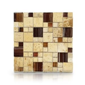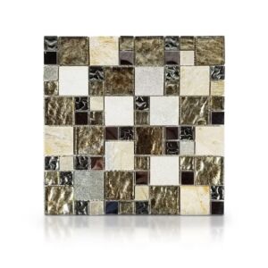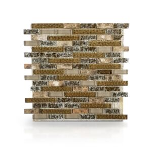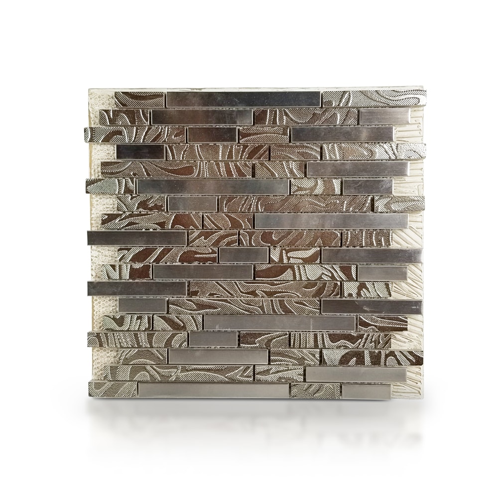This glass mosaic features a silver tribal design. It has an interlocking pattern and measures 1 sq. ft. per tile.